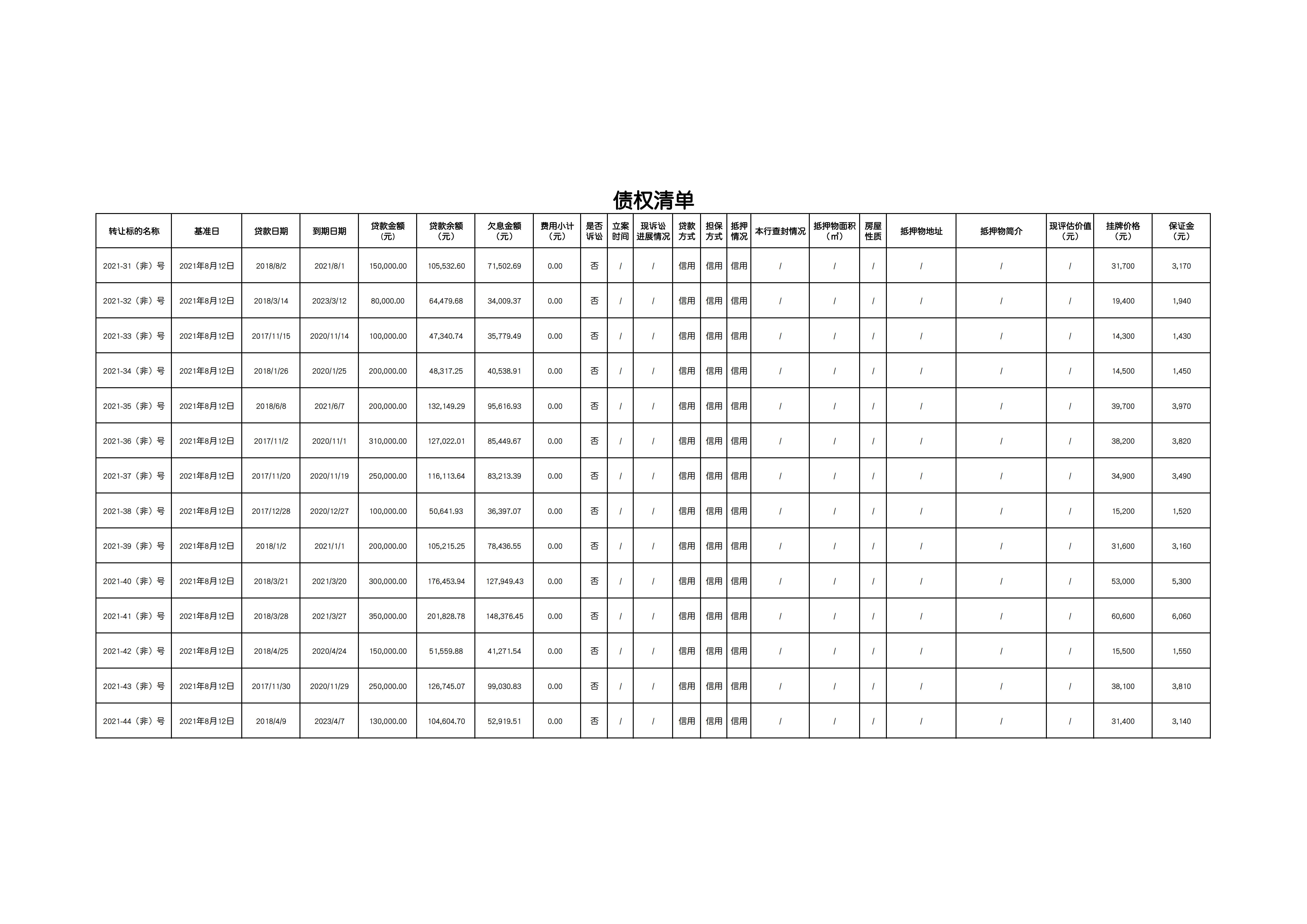 | 重要事項披露 | 一、債權簡介: 詳見附件“債權清單” 因上述債務人未按合同約定履行還款義務,現(xiàn)將上述14戶債權及附屬權益對外公開掛牌轉(zhuǎn)讓。 二、擔保情況: 詳見附件“債權清單” 三、訴訟情況: 詳見附件“債權清單” 四、其他重要披露事項: (一)本項目所涉及的債權及擔保權的合法性、有效性、可能存在風險及瑕疵請受讓申請人自行對該項目情況進行審慎的盡職調(diào)查,自行評判購買風險。如需查閱項目相關資料,請與轉(zhuǎn)讓方項目負責人聯(lián)系; (二)轉(zhuǎn)讓相關稅、費由交易雙方按照有關規(guī)定各自承擔,交易服務費由受讓方承擔。 | |||||||