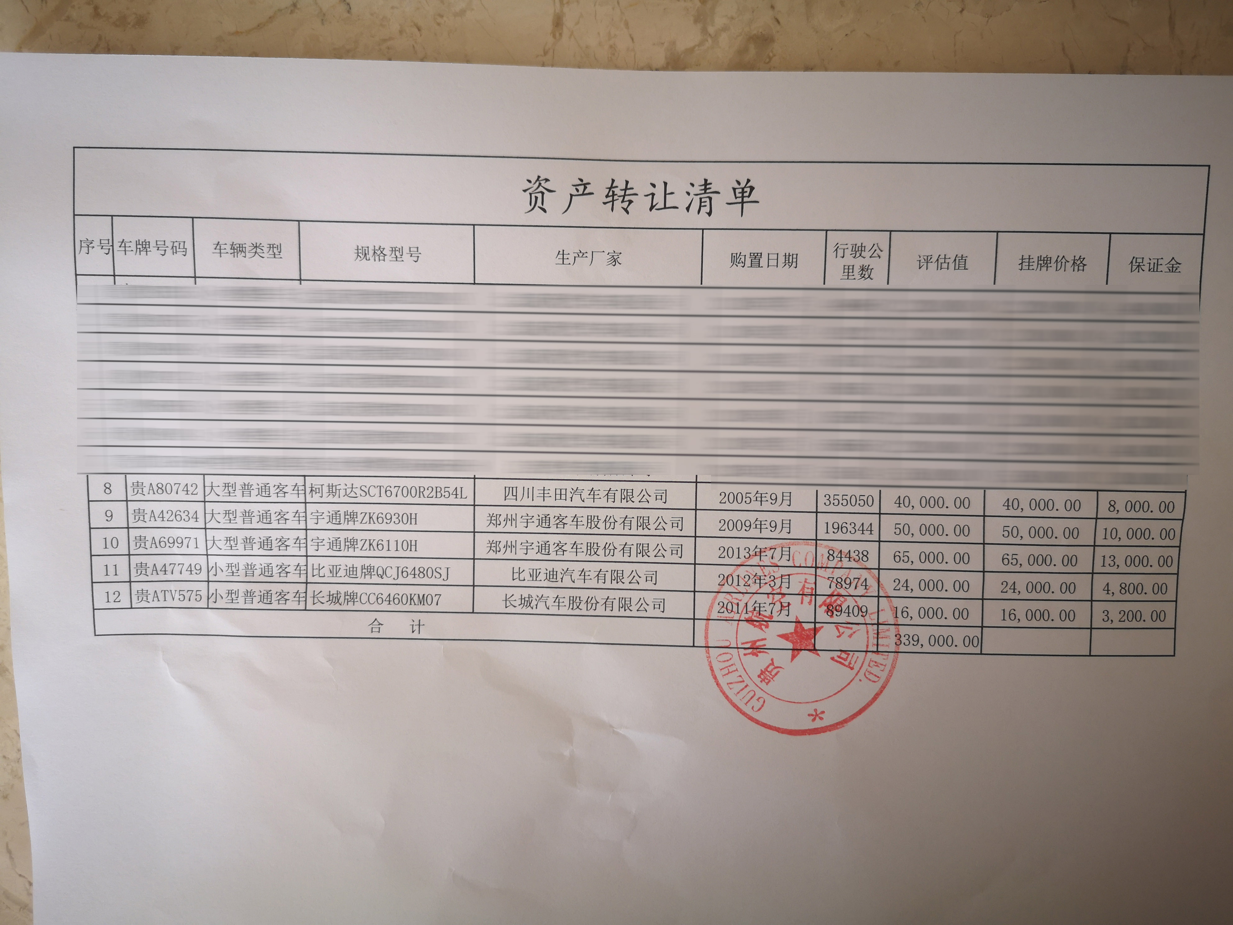 | 重要信息披露 | 1、意向受讓方須自行了解本次轉(zhuǎn)讓標(biāo)的的全部現(xiàn)狀及瑕疵,本次轉(zhuǎn)讓標(biāo)的以現(xiàn)狀轉(zhuǎn)讓; 2、本次轉(zhuǎn)讓車輛共5臺,可單輛受讓,也可多輛受讓; 3、本次轉(zhuǎn)讓的所有車輛由轉(zhuǎn)讓方協(xié)助受讓方辦理過戶手續(xù),過戶產(chǎn)生的所有費(fèi)用由受讓方承擔(dān); 4、本次轉(zhuǎn)讓的5臺車輛均無違章情況并已全部年審; 5、本次車輛有關(guān)信息詳見《資產(chǎn)評估清單》。 | |||||||